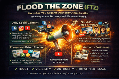 Flood The ZoneSM is an authority accelerator designed to make your dealership consistently visible and recognizable. It’s not about posting more; it’s about positioning your dealership as the trusted voice car buyers recognize, remember, and choose in your first in your community.